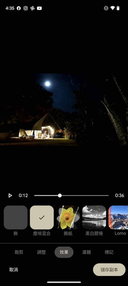 Google 相簿以往內建的影片編輯工具有裁剪影片、調整亮度、對比與濾鏡等選擇可以切換,現在升級到 Google 相簿 app 最新版本後,就加入了塵埃混合、撕紙、黑白膠捲、Lomo、漏光、膠捲氛圍、色差、魚眼、復古、版面配置、懷舊電影與海報等 12 種影片特效。