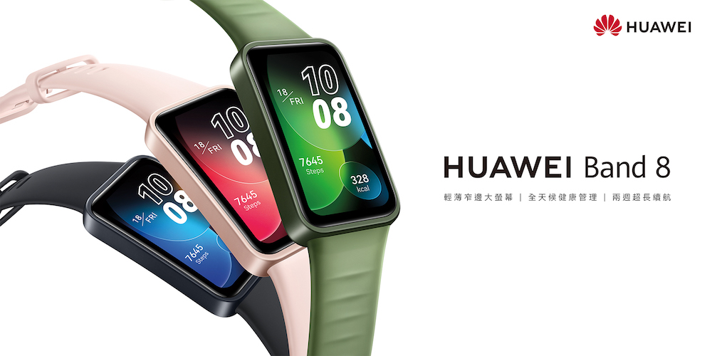 更輕薄全螢幕的機身設計,還有新升級的 HUAWEI TruSleep 3.0、14 天強勁續航,及專業健康管理、智慧助理、穿搭錶盤、來電提醒等軟硬體多項功能。HUAWEI Band 8 在台共上市 2 款材質錶帶、3 種顏色,分別是 TPU 錶帶的幻夜黑以及矽膠錶帶的櫻語粉、翡冷翠,售價 $1,490,7 月 14 日起,在華為全通路販售。