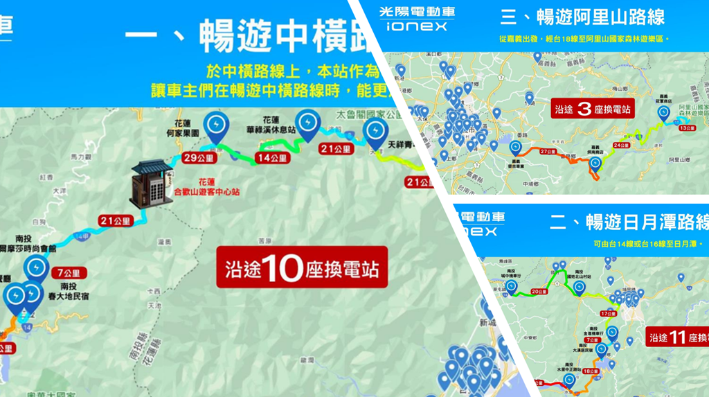 而光陽 Ionex 換電站積極建設也是讓消費者選購的關鍵,目前台灣本島與外島合計 2620 站,日前宣布的合歡山遊客中心站也將於八月正式營運,讓中橫電動機車旅行更安心愜意。另外像是日月潭與阿里山路線,也都有綿密的換電網,讓暑期機車旅行更輕鬆。