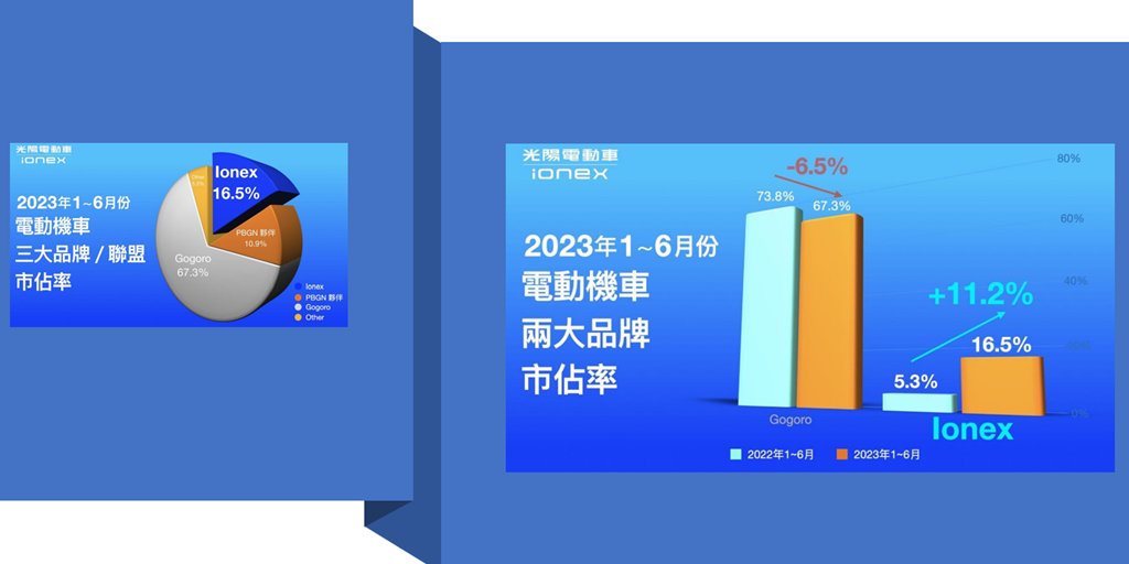 根據光陽提供資料表示,2023 上半年,Ionex 市佔已達 16.5%,較 2022 年同期成長 11.2%,超越 PBGN 夥伴總和市佔 10.9% 相當大的距離。雖然離電動機車龍頭 67.3% 市佔還有相當大的距離,但原本 2022 上半年有著 73.8% 市佔的 Gogoro,今年同期下滑 6.5%,顯示消費者在選擇電動機車上,已開始看到 Gogoro 以外的選擇。