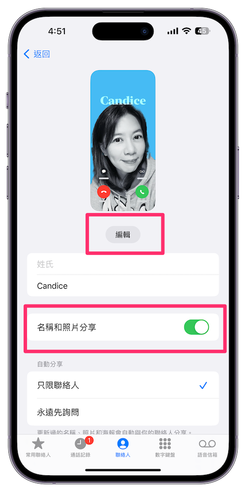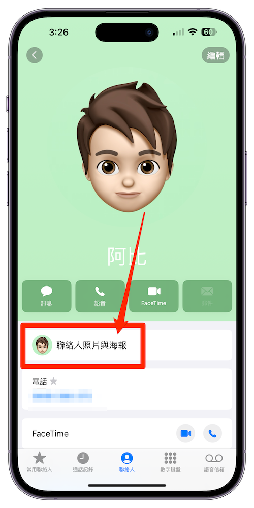 步驟 1、打開「電話」中的「聯絡人」,這邊我們先為自己設計,所以就選擇最上方自己名字,接著選擇「聯絡人照片與海報」,選擇上方中央的「編輯」。