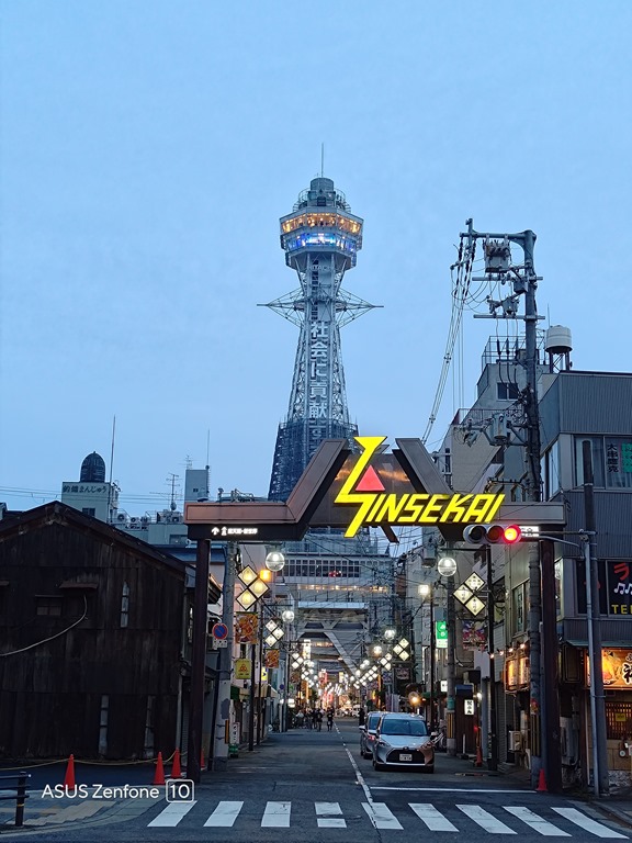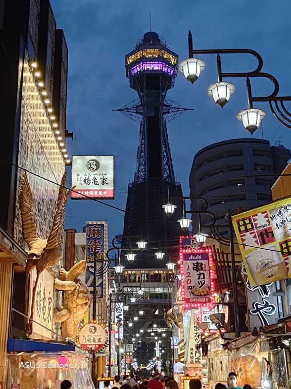 通天閣位於新世界商圈,第一代建設於 1912 年,後來不幸被大火燒毀,現在看到的樣貌已經是第二代,是由東京塔的設計者內藤多仲設計。近期可能因為整修的關係,晚上並沒有點燈,但見到了難得沒點燈的模樣也是值得紀念,結合商店街的熱鬧情景拍攝也別有一番風味。