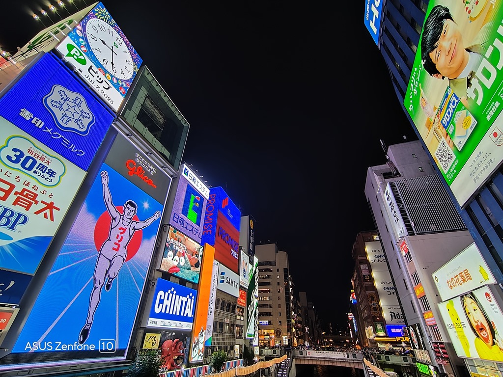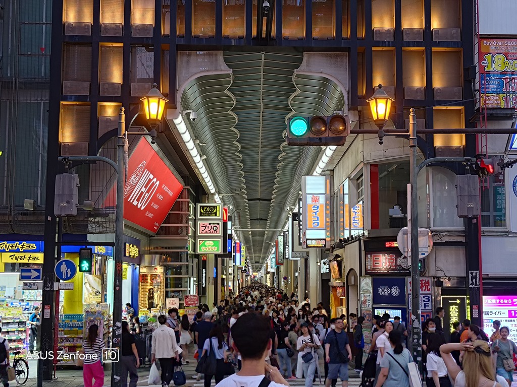 這是大阪觀光客必逛的區域,我們幾乎每天晚上都會來走走,其熱鬧與擁擠,也讓人忘記前幾年疫情的蕭條。來這裡一定要拍下固力果跑跑人,也可以從商圈入口拍下人流密集的筆直商圈道路。