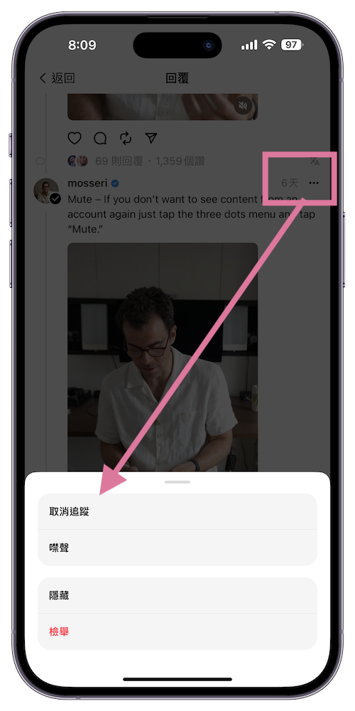 3、取消追蹤與噤聲 – 在看影片的時候,按下上方的「…」 ,就會有「取消追蹤」、「噤聲」、「隱藏」與「檢舉」的選項。