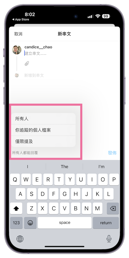 1、設定回覆對象權限 – 在發表貼文的地方點選下方的「回覆所有人」,就會有「所有人」、「你追蹤的個人檔案」與「僅限提及」三種權限能夠切換。這樣之後就能設定自己的貼文有哪些人才能看到。