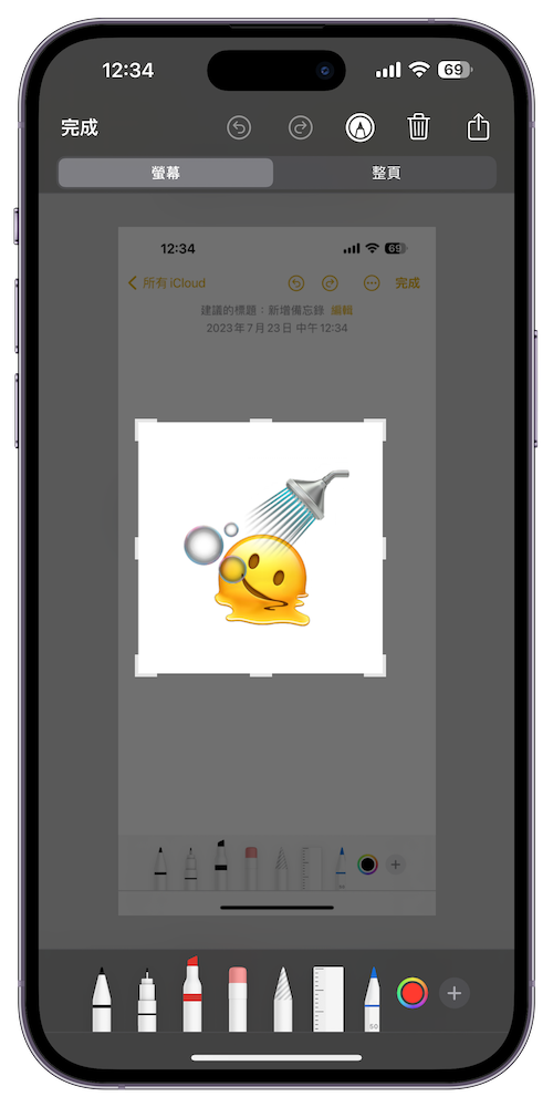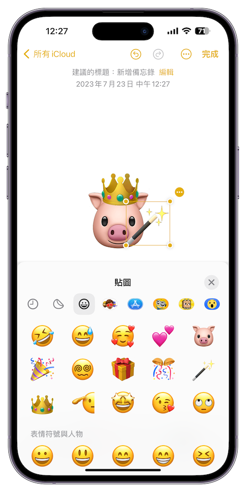 步驟 2、 選擇「貼圖」下方 emoji 的選項,接著就能從中挑出想要拼貼的 emoji 圖案,再來利用邊框調整大小與位置。