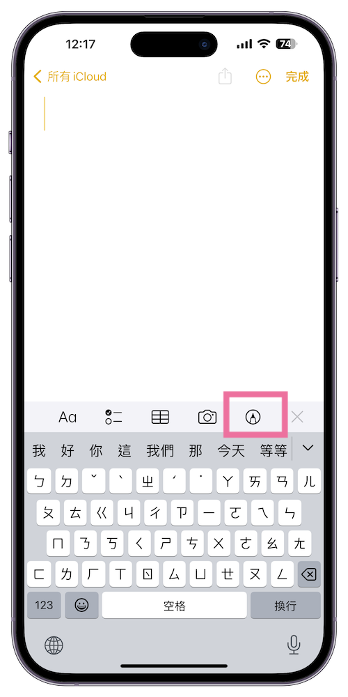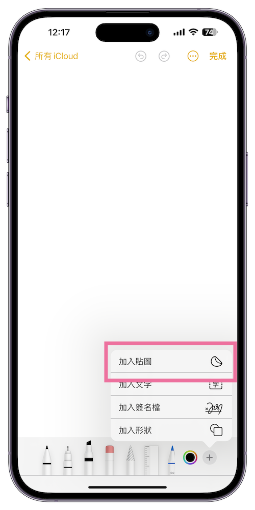 步驟 1、開啟「備忘錄」後選擇右下的「筆刷」圖示 >>> 選擇旁邊的「+」>>>「加入貼圖」。