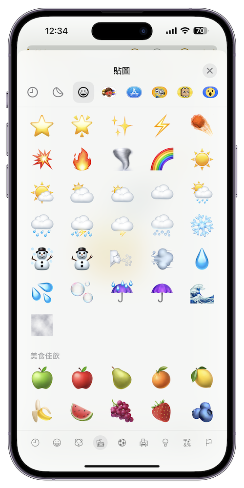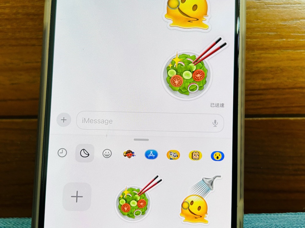 步驟 5、接下來就跟製作照片貼圖一樣的動作,在 iMessage 中使用「貼圖」後就能看到剛剛加入的 emoji 拼貼囉!
