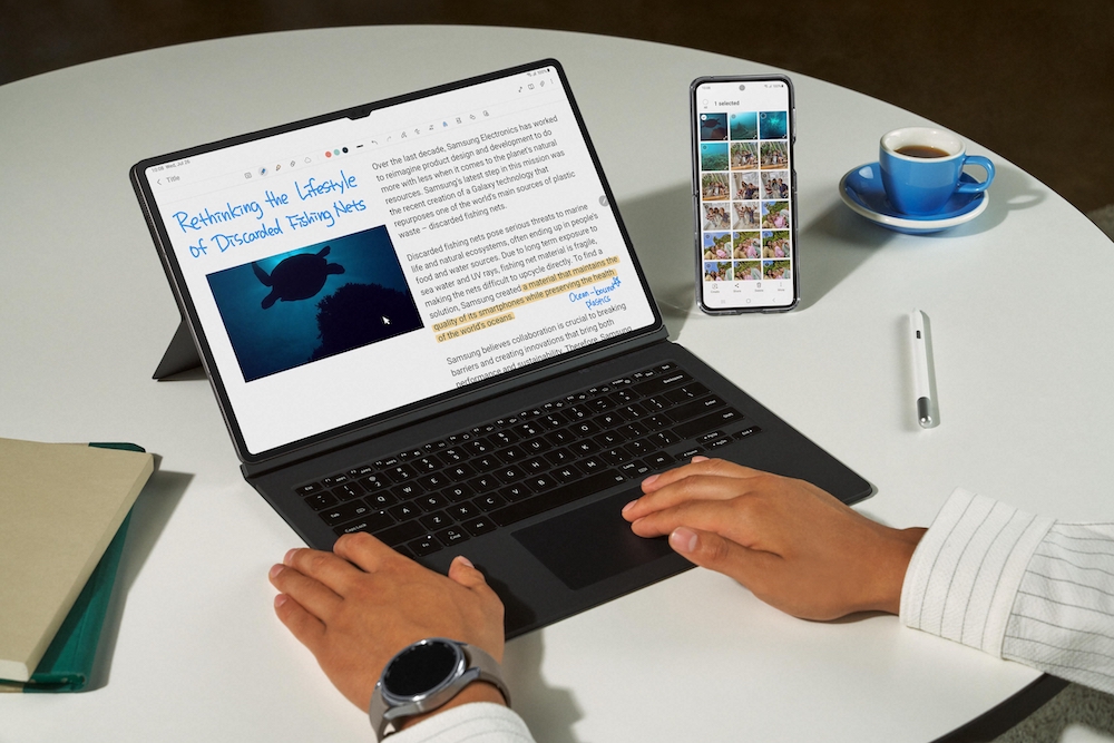 Galaxy Tab S9 系列同樣能加入三星的生態圈,使用多功能操控 (Multi Control) 功能,只要同一個三星帳號,就能透過平板鍵盤皮套的觸控板來在裝置間互相複製貼上、拖曳文字、影片與使用檔案。