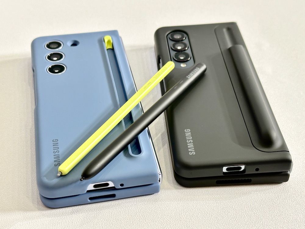 ▲ 新的 S Pen 體積更小巧,內嵌式保護殼讓 Z Flod 5 放在桌上時可以更為平躺。(左為 Z Fold 5、右為 Z Flip 5)