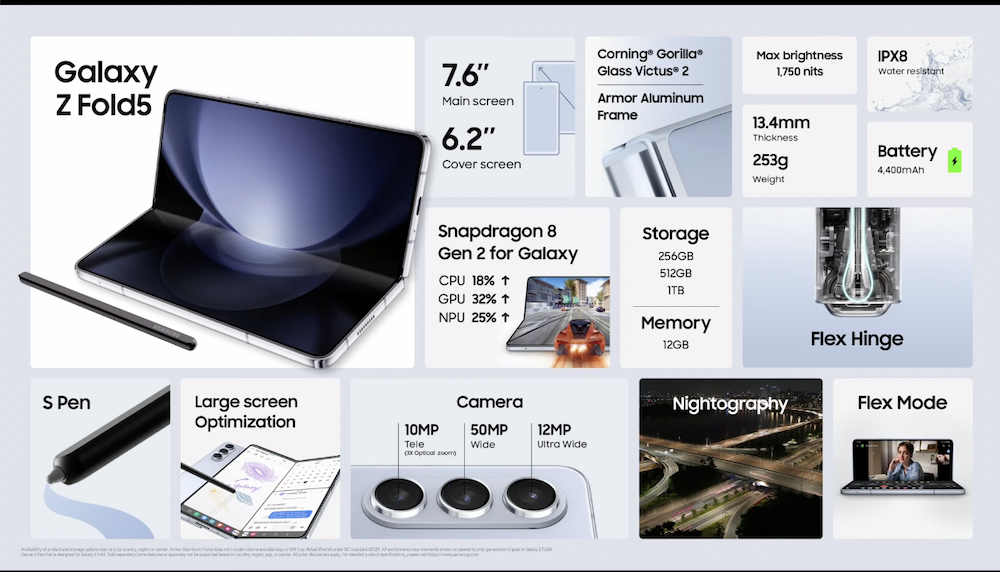 相機規格方面 Z Fold 5 主相機延續了 Z Fold 4 的三鏡頭配置,包含 5000 萬畫素廣角鏡頭(支援 OIS、Dual Pixel、F1.8)、1200 萬畫素超廣角鏡頭(F2.2、123 度廣角)以及 1000 萬畫素 3X 望遠鏡頭(OIS、F2.4)。內螢幕同樣配置 400 萬畫素 F1.8 的螢幕下鏡頭 ,外螢幕搭配 1000 萬畫素 F2.2 前置開孔鏡頭。