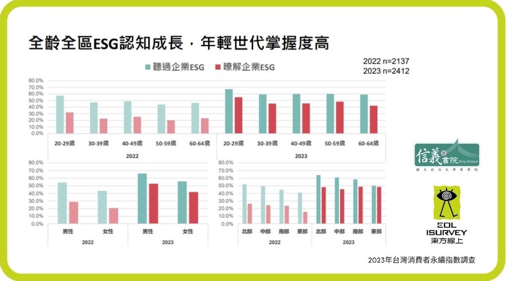 調查顯示,與去(2022)年相比,全齡全區ESG認知皆有成長,以年輕世代20-29歲聽過及瞭解ESG比例最高(54.8%);男性認知度(52.7%)亦較女性(41.8%)來得高。與 2022 年相比,高收入者的 ESG 認知度大幅提升,收入愈高,愈關注報章媒體報導的企業 ESG 表現。同時收入愈高,也愈願意購買社會企業的產品,即使價格貴一點也不介意。