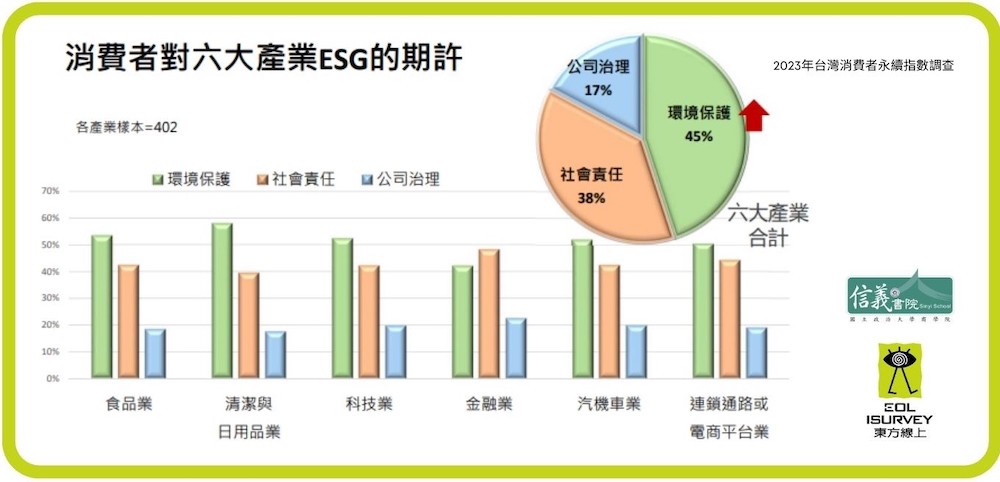 《2023消費者永續指數報告》分別針對食品、清潔日用品、科技、金融、汽機車業及連鎖通路(含電商平台)等 6 大產業,瞭解消費者對於企業 ESG 的期許與評估。從數據來看,消費者最關注的環境議題(E)占 45%,其次是社會責任(S)占 38%,和較不易理解的公司治理(G)占 17%。