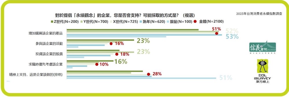 東方線上研究也發現,Z 世代對於提倡永續的企業,更願意參與品牌活動,也優先考慮求職。雖然目前收入不高,無法增加對企業的消費,但隨著年齡成長,消費能力必然成長。Z 世代將是迎接下一個永續世代的關鍵族群。