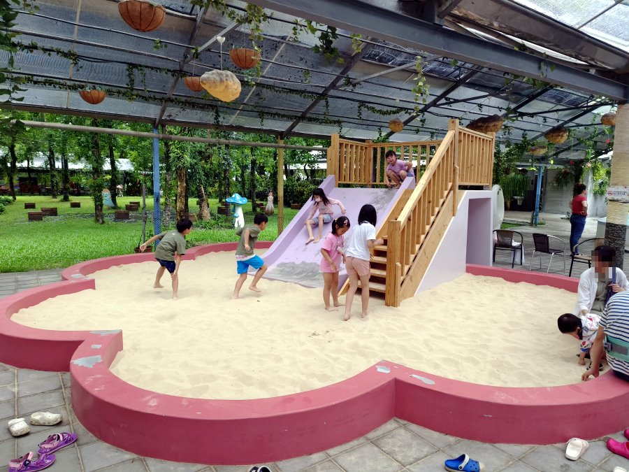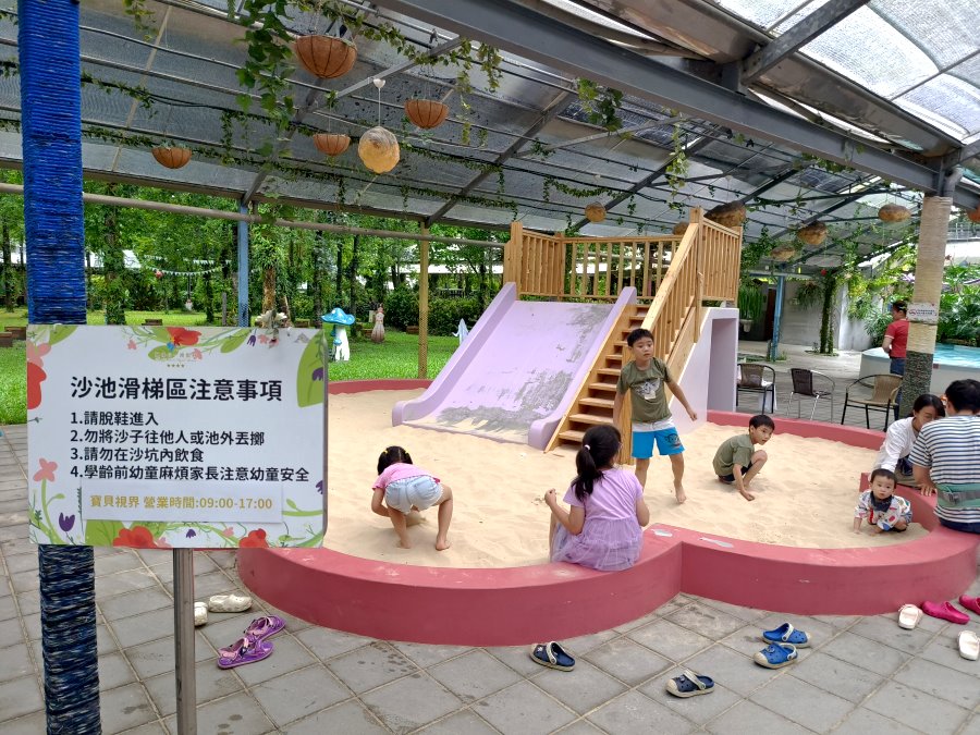 ▼小朋友看到沙坑、溜滑梯整個很開心,脫鞋後就跑進去玩耍啦~~這裡的沙子很細膩,維持得也很好,不過還是要多留意小朋友安全!這裡的營業時間是9~17點,時間到服務人員就會用帆布將沙坑覆蓋起來囉!