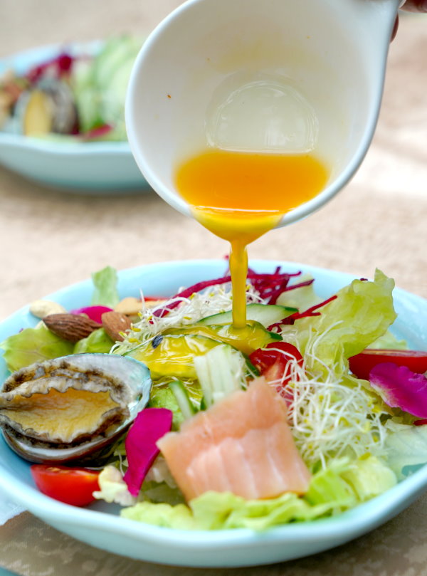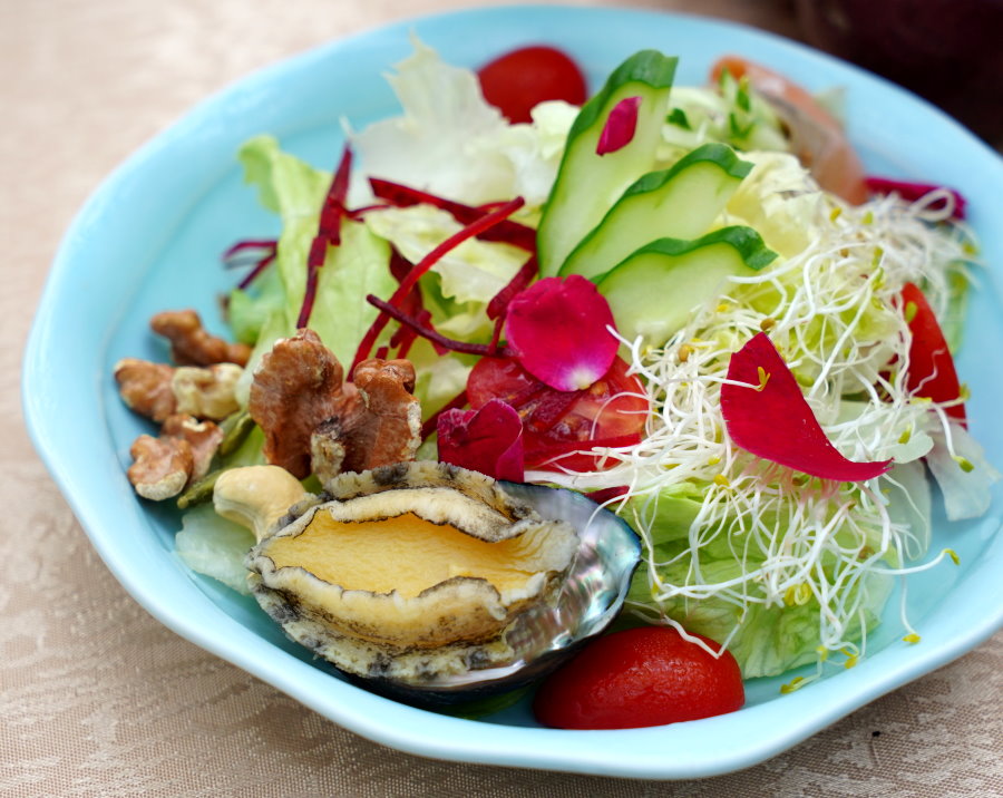 ▼第一道為百香果和風沙拉,採用農場自行栽種的無毒蔬菜、食用花,搭配鮑魚、燻鮭魚捲,看起來繽紛又華麗!