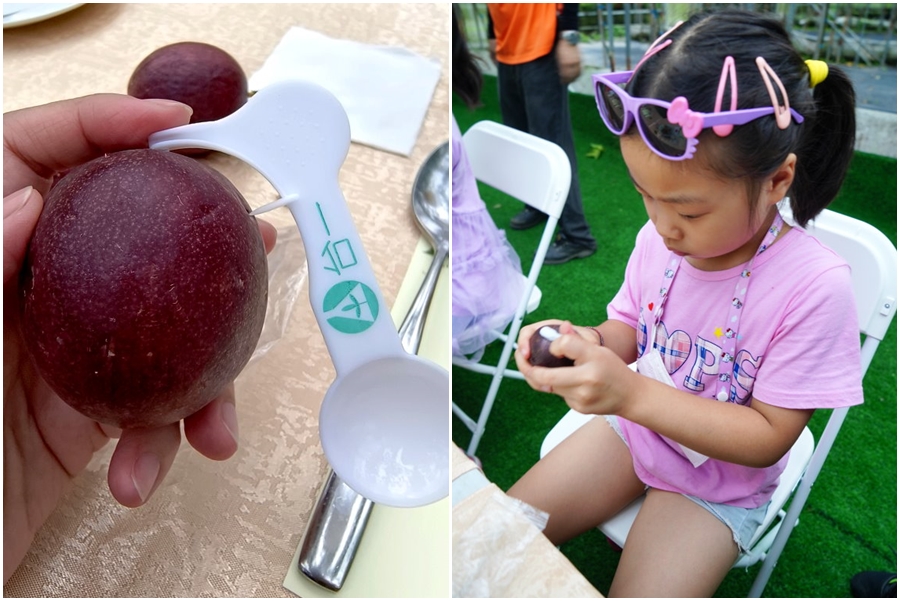 ▼接下來要來享用我們剛剛自行挑選的百香果啦!!一旁的百香果食用工具是農場自行開發研製的,還有獲得專利唷!
