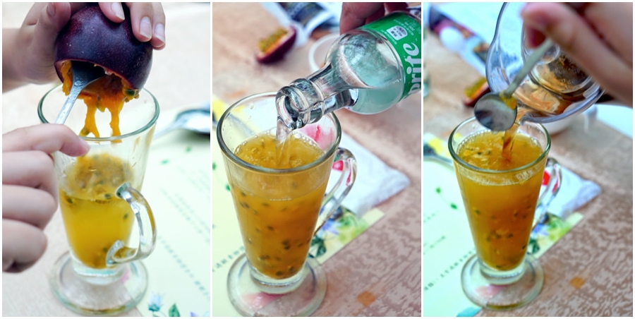 ▼接著要來調製百香果手作飲啦~~將剖開的百香果果肉挖入冰塊杯中,將氣泡水倒至七分滿左右,最後由工作人員倒入紫蘇梅汁攪拌均勻就完成啦!
