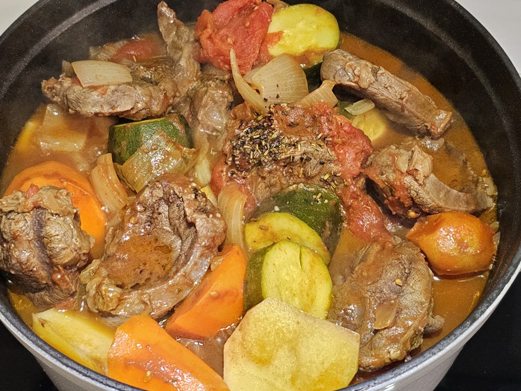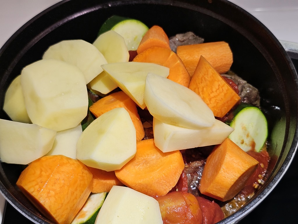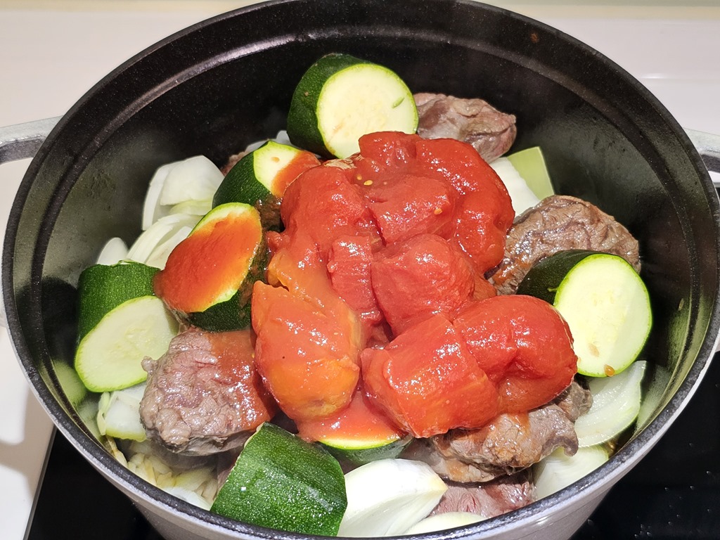 在牛肉煎好後,接下來都不用洗鍋子,直接將煎牛肉的肉汁與油用來爆香洋蔥,當味道出來後,依序將大塊的洋蔥、櫛瓜…等易出水的材料放下層,也可以一層洋蔥一層牛肉方式擺放,或是乾脆不管直接一起到下去也可以。最後放入番茄,我習慣使用義大利酸番茄罐頭,酸味與香氣都比牛番茄更好。