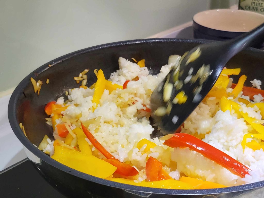 煎好海鮮後的鍋子不用洗,接下來就是一鍋到底的方式了。將洋蔥與彩椒先放入快炒到香氣出來後,放入白飯稍微拌炒一下。