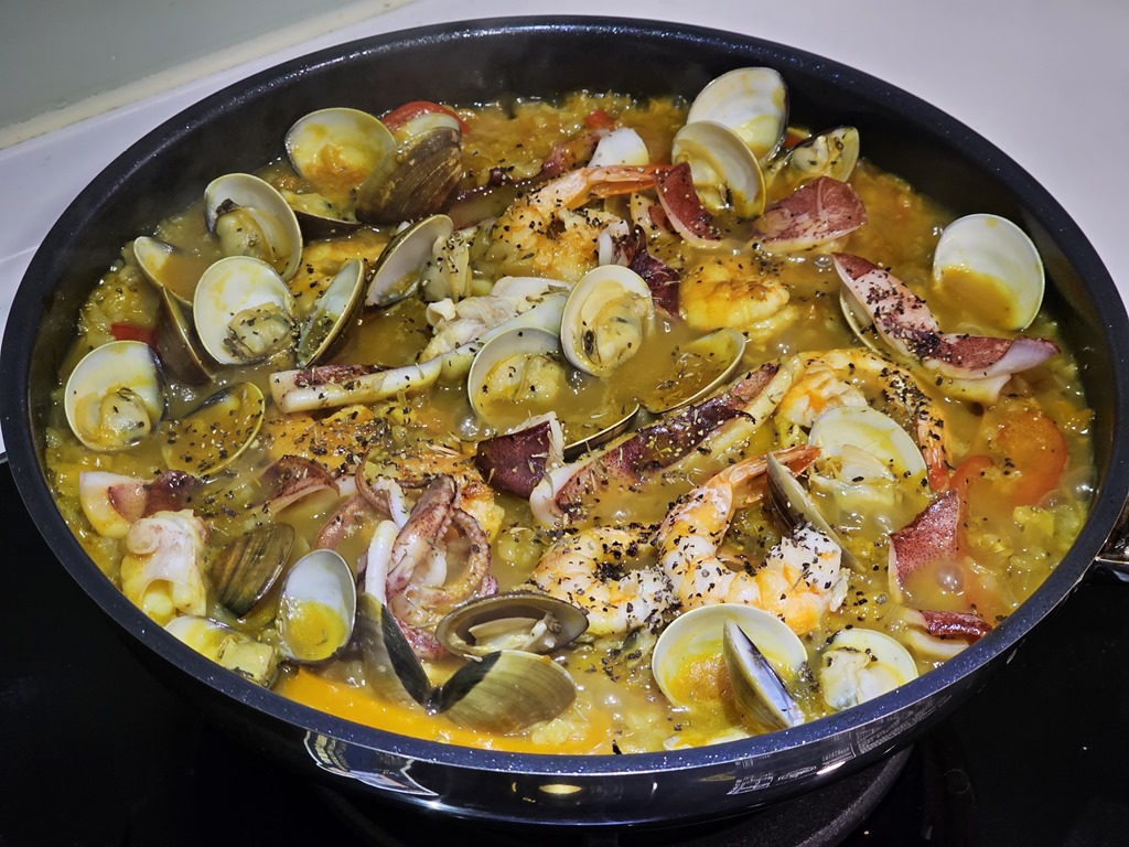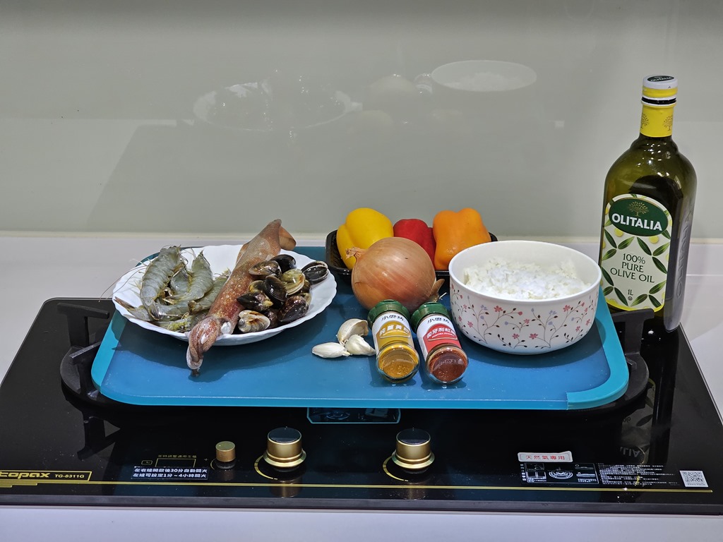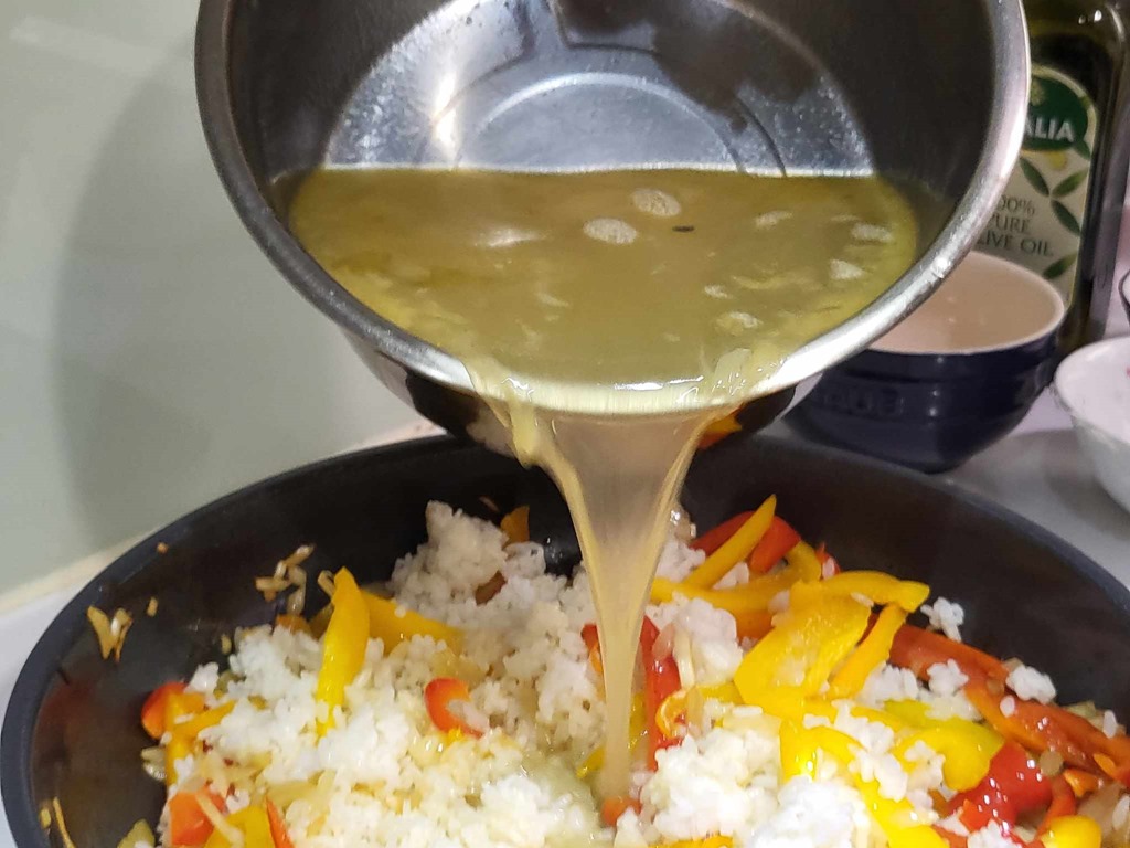將白飯、洋蔥與彩椒拌勻後,倒入剛剛準備的高湯,並撒上薑黃粉、紅椒粉與其他調味,拌勻後不用蓋蓋子,大約 8 分鐘後等湯汁收乾一些,同樣移到左爐定時,你就可以空出手來整理流理台,畢竟處理海鮮後的流理台沒有趕快整理會很臭。