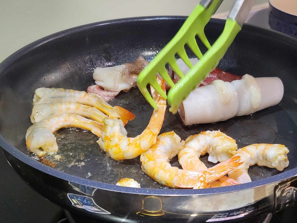 接著使用大火將海鮮煎好備用,只要煎到表面恰恰的就好,不用管有沒有熟透,因為最後還會再次放入鍋中烹飪。