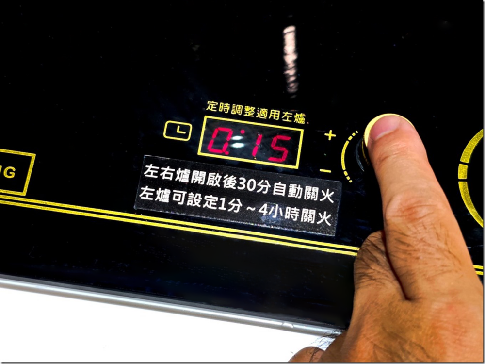 另外在燉煮食物或熬湯時,常常都會超過 30 分鐘、甚至 1~2 個小時以上,這時候就可以利用左爐設定長時間燉煮的功能。左爐可設定 1 分鐘到 4 小時關火,只要旋轉旋鈕到指定時間,就會立刻開始倒數計時,到只剩一分鐘時,就會以秒數倒數讓你知道還有多久關火。這不只可以預防長時間燉煮忘記關火,還能當成計時器使用,非常方便。