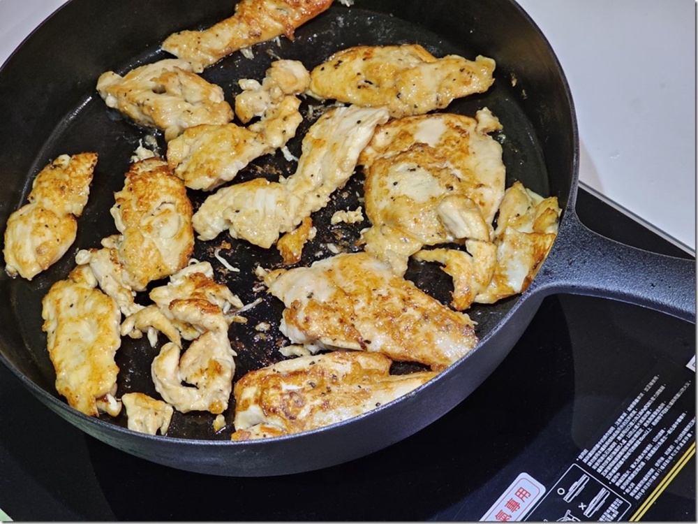 首先用大火將牛肉煎至半熟後備用,雖然莊頭北 TG-8311G 雙控安全定時檯面爐是家庭用爐,但大火的火力很強,而且雙環大火力鍋具受熱面積大,建議使用鍋底較小的鑄鐵鍋實,不要讓焰火超出鍋底。