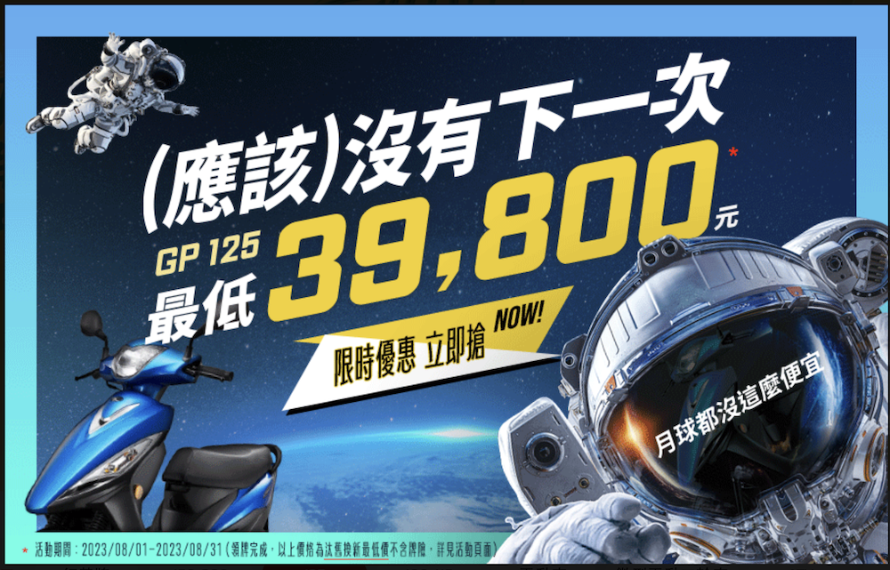 這次促銷方案主打 GP 125 的七期鼓煞(SJ25ZN)車型,原本建議空車價為 57,000 元,但光陽提供了 6,500 元的購車金、加碼 4,400 元優惠,再加上政府環保署的汰舊換新補助 2,000 元、貨物稅減免 4,000 元以及廢車回收獎勵金 300 元後,消費者最低只需 39,800 元(不含牌險)便能夠入手。只是要注意的是消費者必須自 2023 年 8 月 1 日至 2023 年 8 月 31 日內完成領牌才能適用此優惠方案。