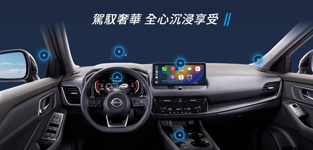 X-Trail 一如過往的重視座艙肅靜性,除了全車靜音工程,前擋與前座皆使用雙層玻璃強化隔音,引擎室防火牆使用 3層隔音材質,將車外噪音與引擎運轉聲有效阻隔於座艙之外;另外 4 代 X-Trail 也朝座艙數位化邁進,雙 12.3 吋數位儀表板、 10.8 吋抬頭顯示幕,營造出恰到好處的科技氛圍。