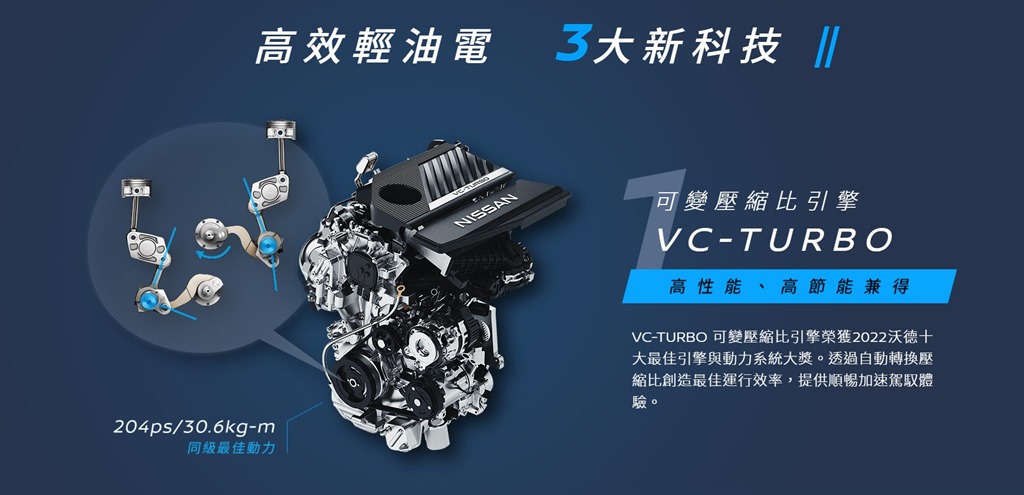 Nissan 車款以座椅舒適性著稱,甚至有人說開 Nissan 是買沙發順便送輪胎的概念,雖然只是玩笑話,不過 3D 超體感舒壓座椅確實坐過就難以忘懷。國產 4 代 X-Trail 最大進化莫過於導入引擎代號 KR15DDT 的 VC-TURBO 可變壓縮比引擎,這具引擎可是榮獲 2022 年 WardsAuto 十大最佳引擎與動力系統大獎,可以在國產車實現量產相當不簡單。 VC-TURBO 可變壓縮比引擎加速時使用低壓縮比提高馬力輸出,高速巡航時使用高壓縮比節省油耗,加上 12V 鋰電池在起步時驅動電動馬達輔助,降低引擎負荷,讓 X-Trail 繳出 16km/l 的低油耗成績。雖然 X-Trail 的輕油電系統無法像同級對手 RAV4 Hybrid 有純電行駛模式,不過 X-Trail 引擎本身輸出功率大,駕駛者所感受到的暢快感,是 RAV4 Hybrid 所缺乏的。