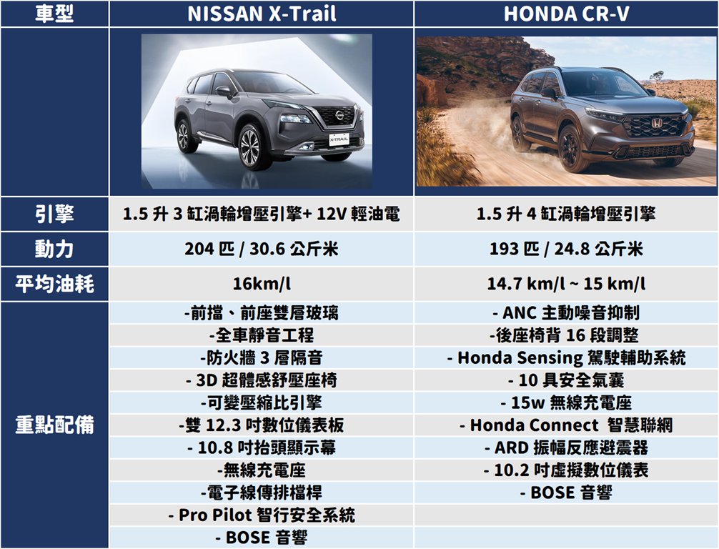 打新世代家族設計語彙、強化後座舒適性、首度導入 Honda Connect 智慧聯網,正式售價為 108 萬、 118 萬、 128 萬。X-Trail 與 CR-V 價格帶接近,也互為同級對手,不過兩部車的特色不同, X-Trail 有什麼優勢、 CR-V有何不能取代的魅力,以下簡單快速地告訴你。