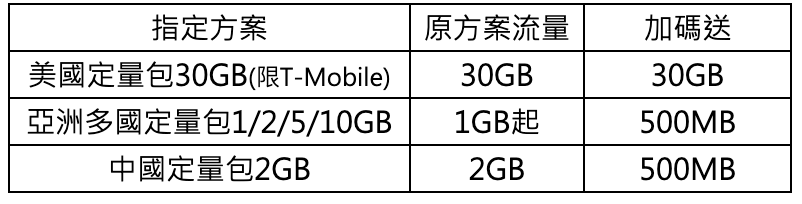 優惠一:指定方案加量不加價、最高雙倍送 亞洲單日 99 元起