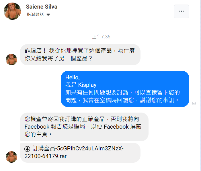 近期接到的粉絲團私訊內容,以遭受詐騙消費者的角度,控訴網路店家寄送錯誤產品,並威脅檢舉粉絲團,最後會附上一個壓縮檔,引導你打開觀看。