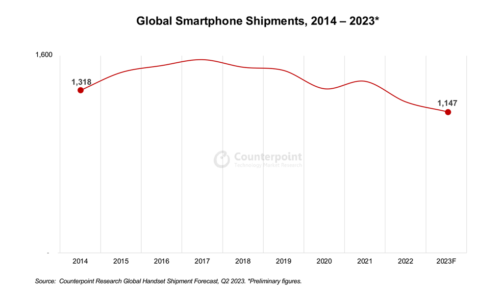 濟與報復性消費氛圍讓智慧型手機銷售有著曇花一現的復甦外,整體銷售衰退趨勢相當顯著。雖然今年走出了疫情的陰霾,但通貨膨脹的下降與經濟復甦的趨勢,並沒有帶給消費者足夠信心,Counterpoint 分析團隊指出,2023 年智慧型手機銷量將創 10 年新低。