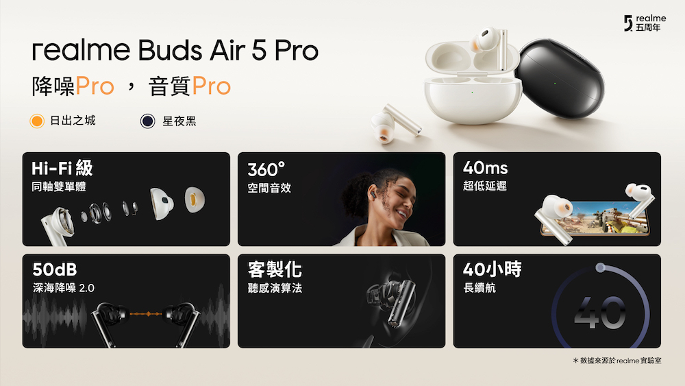 全球成長最快智慧型手機品牌 realme 將於 8 月 28 日迎來創立五周年,喊出「越級而上」口號,推出兩款「越級之作」,包括了音質降噪雙王牌 realme Buds Air 5 Pro,錄音室級原音體驗,並將於 8 月 24 日越級登場!