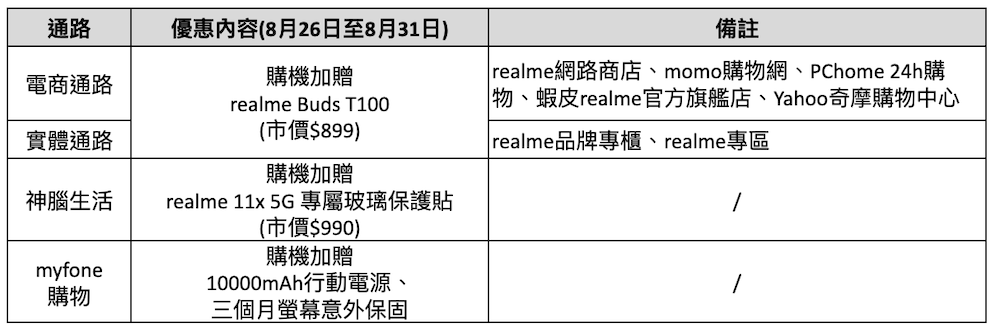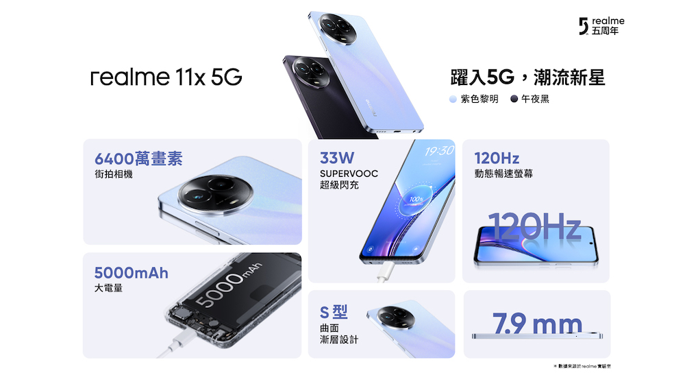 realme 11x 5G 推出紫色黎明、午夜黑雙色,配置 8+128GB 版本,售價 7,490 元,將於 8 月 26 日起正式上市,8 月 26 日至 31 日期間購買加贈限定早鳥禮,贈品數量有限,搶完為止。也將於 9 月 1 日起在中華電信、台灣大哥大、遠傳電信及亞太電信等電信通路上架開賣。