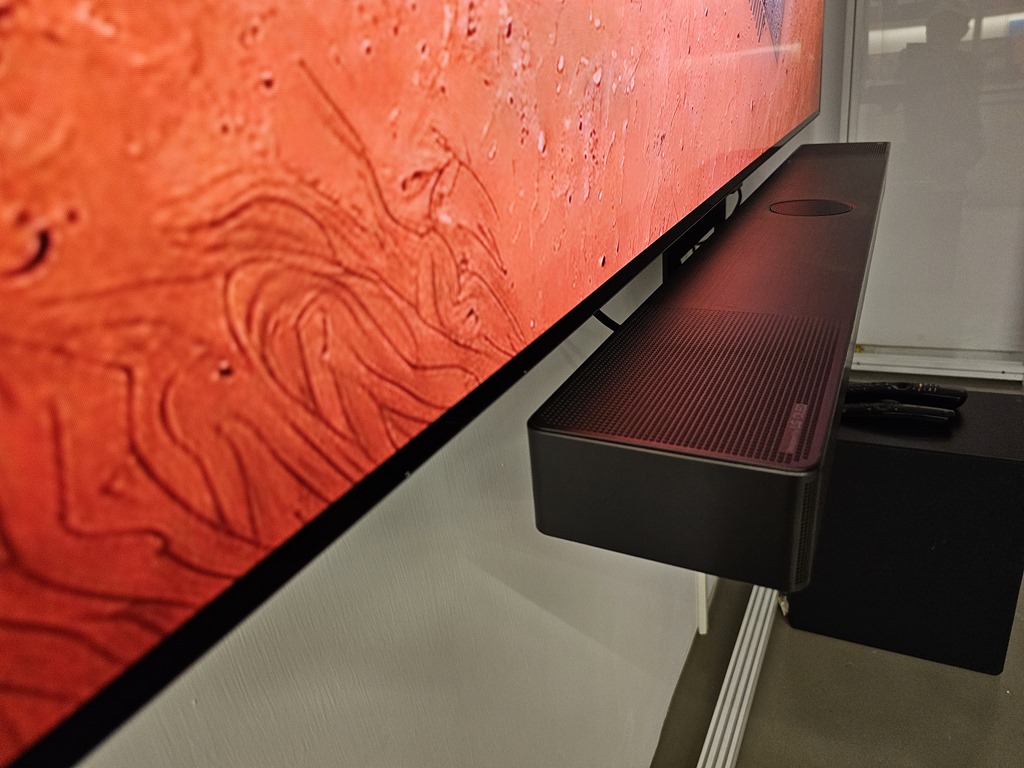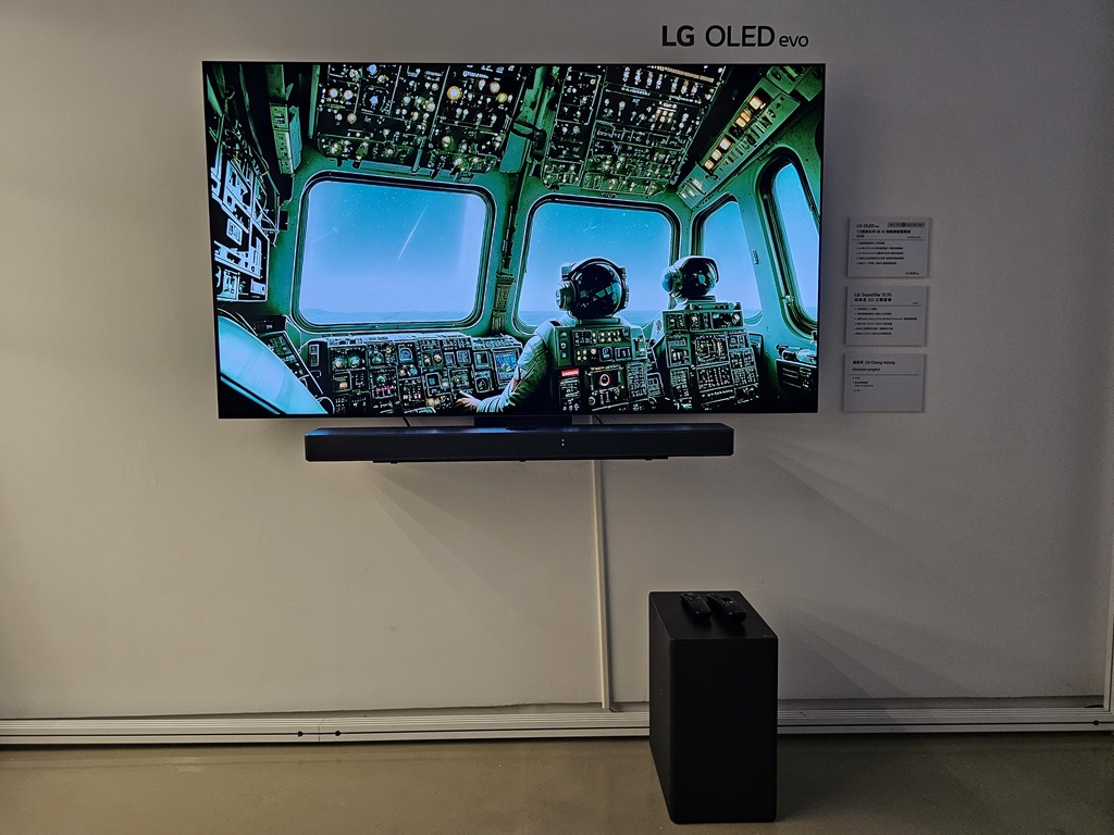 聲音部分透過新一代晶片的 AI 深度學習,提升清晰度與平衡,提供虛擬 9.1.2 聲道。另外今年還推出有著 3.1.3 聲道超維度 6D 立體聲霸  LG Sound Bar SC9S,有著三重空間環繞音效搭配三重向上天空聲道,環繞效果極佳,可感受物體於天空移動的氛圍。這款聲霸可搭配 OLED C 系列,以專屬支架結合,讓壁掛電視也不用擔心聲霸擺放位置。