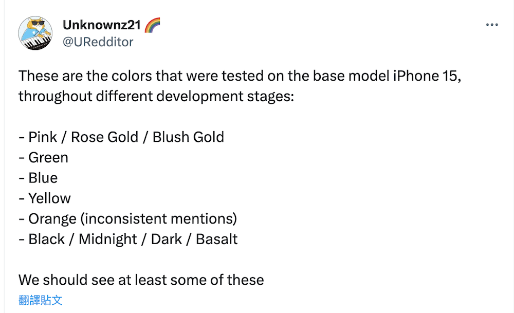 而這個充電線顏色消息,恰巧也對應了 X 上另一名爆料者 Unknownz21 所透露 iPhone 15 和 iPhone 15 Plus 兩款機型的顏色,其中粉色與橙色是目前大家推測此次 2023 iPhone 15 的新色候選色。不過推文中也保守表示,這只是 Apple 目前正在為 iPhone 15 所測試的顏色,因此屆時究竟會有哪些顏色正式發表,目前還無法確認。
