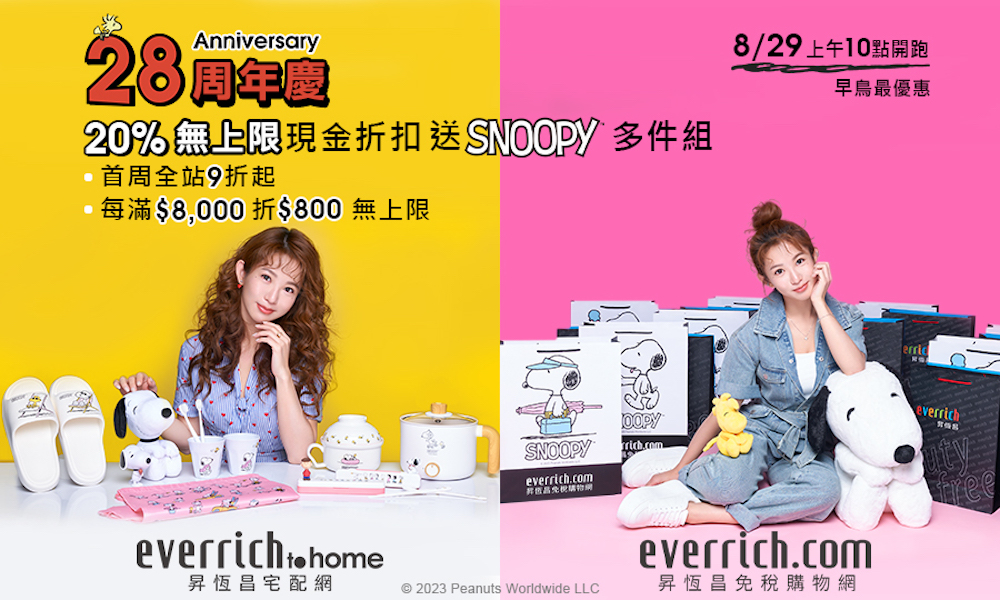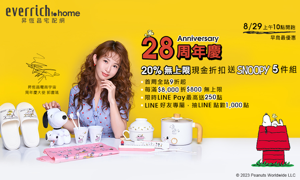 史努比SNOOPY」,推出周年慶方案:《昇恆昌免稅購物網》及《昇恆昌宅配網》全站商品 9 折起 + 每滿 8,000 折 800 無上限,相當於 20% 無上限現金折扣,且滿額再送 SNOOPY 限定禮多件組!