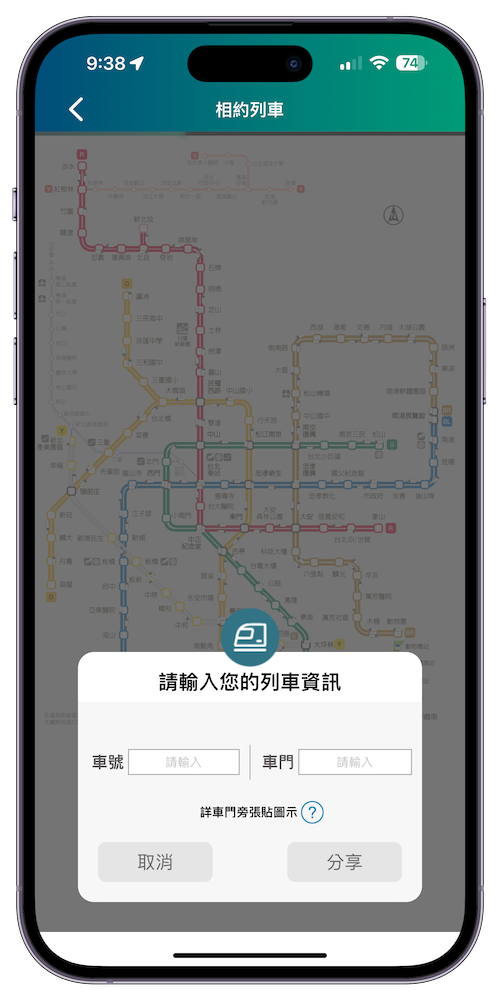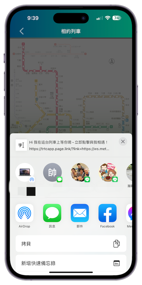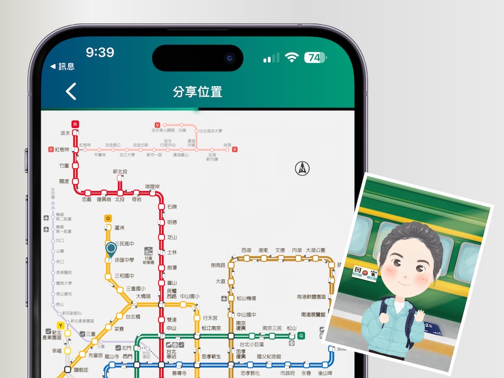 置分享給約定的朋友,讓對方迅速定位列車所在位置及車門,與朋友相約更聰明有效率。