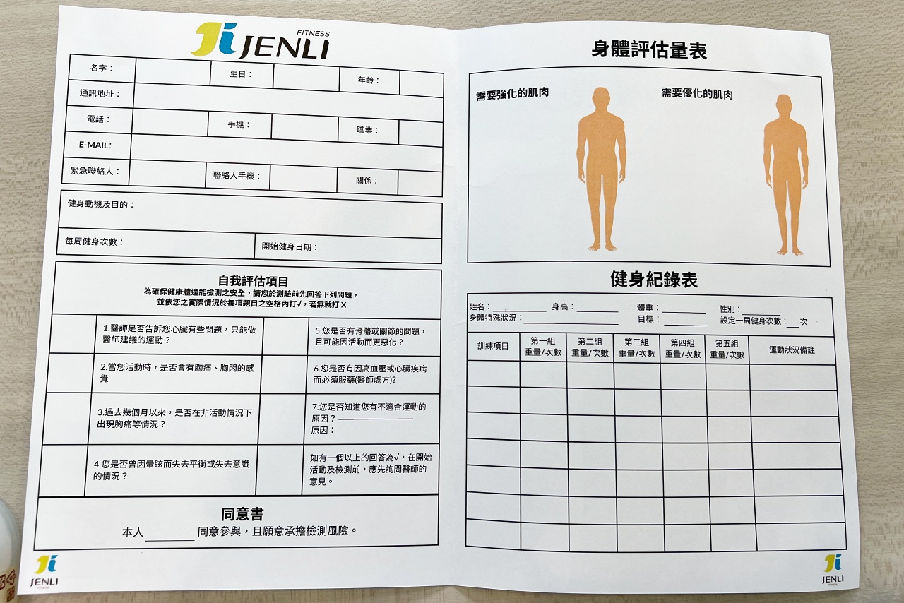 在開始訓練之前會提供一張基本資料的記錄表,上面有基本資料要填寫、自身知道的身體狀況填寫,以及每次訓練的健身記錄表、教練建議需要強化的肌肉群紀錄。我覺得這點很貼心,會依據每個人身體狀況提供適合的運動建議。