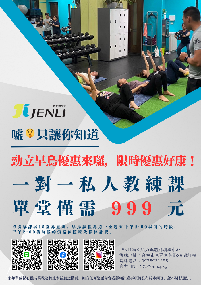 【勁立JENLI】健身房的教練群都很年輕,但專業證照跟資歷可是沒少的。跟其他大型連鎖的健身房相比,更多了親切感與細膩度,從客製化課程到一對一訓練,或是團體訓練都有提供,也提供到公司、社區教學,把運動帶進生活裡,讓更多人可以感受到運動的好處與快樂。重點是免年費、免入會費、完全不推銷,感受度真的很好。
