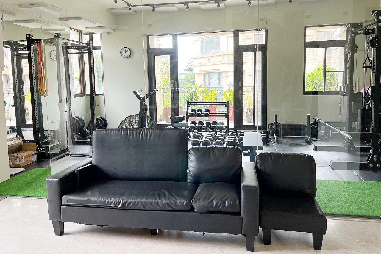 以社區健身房為走向的【勁立JENLI】健身房二樓有個休息空間,提供沙發區、廚房、浴室,讓學員可以自由使用,我說這裡根本就是自己家一樣了,完全沒有距離感。