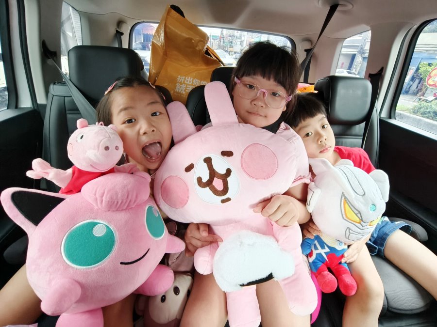 ▼三口組一上車就把戰利品拿出來玩耍,真的是滿滿一車無誤~~我們終於買到小口愛的生日禮物,大家都開心啊!