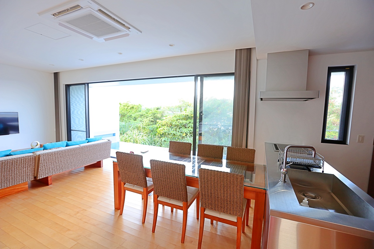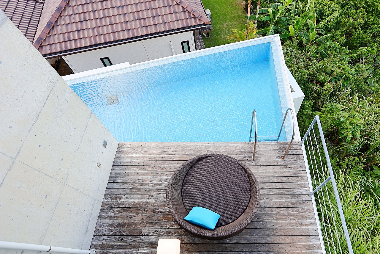 二樓泳池是一大賣點,畢竟我們也是超期待來到這個villa享受泡在泳池裡,喝著沖繩啤酒的行程。天氣好的時候可以把落地窗通通打開,讓泳池跟室內連成一線,享受海風吹拂進來的愜意感。