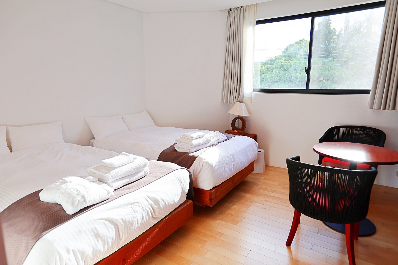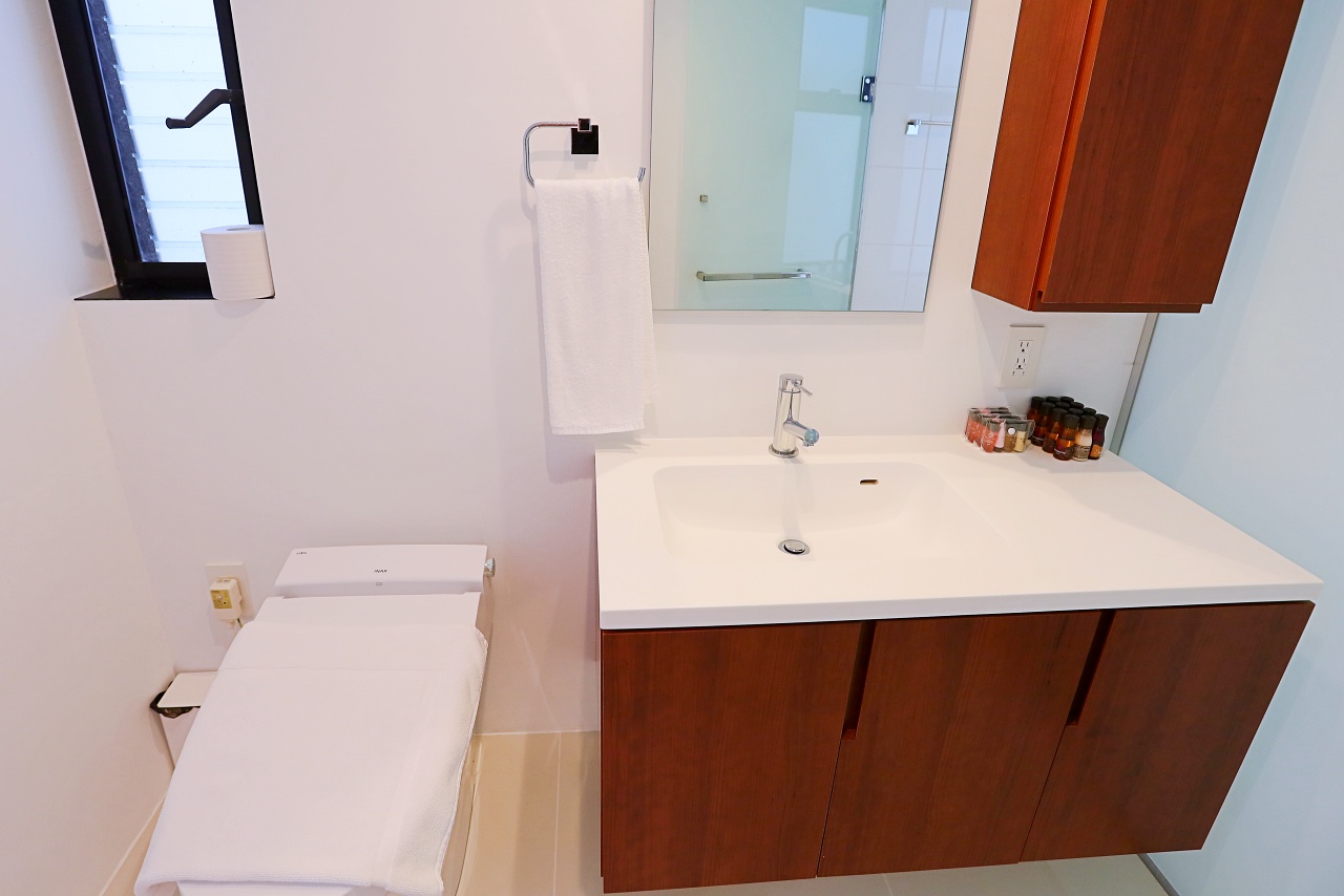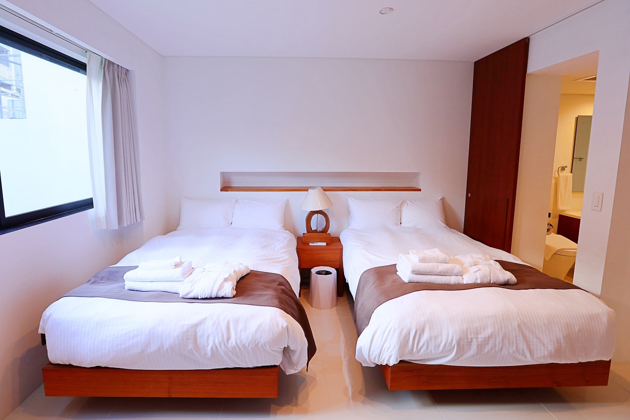 一樓房間有兩張雙人床,房間內擺設有圓形小桌(這個對於出外還需要用筆電工作的我實在太方便啦),還有大空間的更衣間。浴室乾濕分離有浴缸、淋浴設備、免治馬桶,以白色建築來說,環境清掃的挺乾淨的,沒有多餘裝飾,給人乾淨整潔又舒適的氛圍,一進到房間就忍不住往床上一躺,床墊跟枕頭都是舒適的。