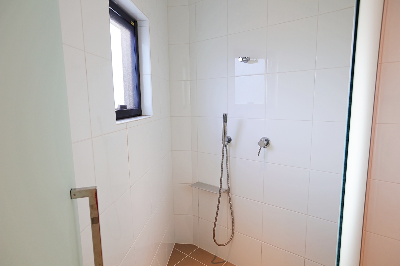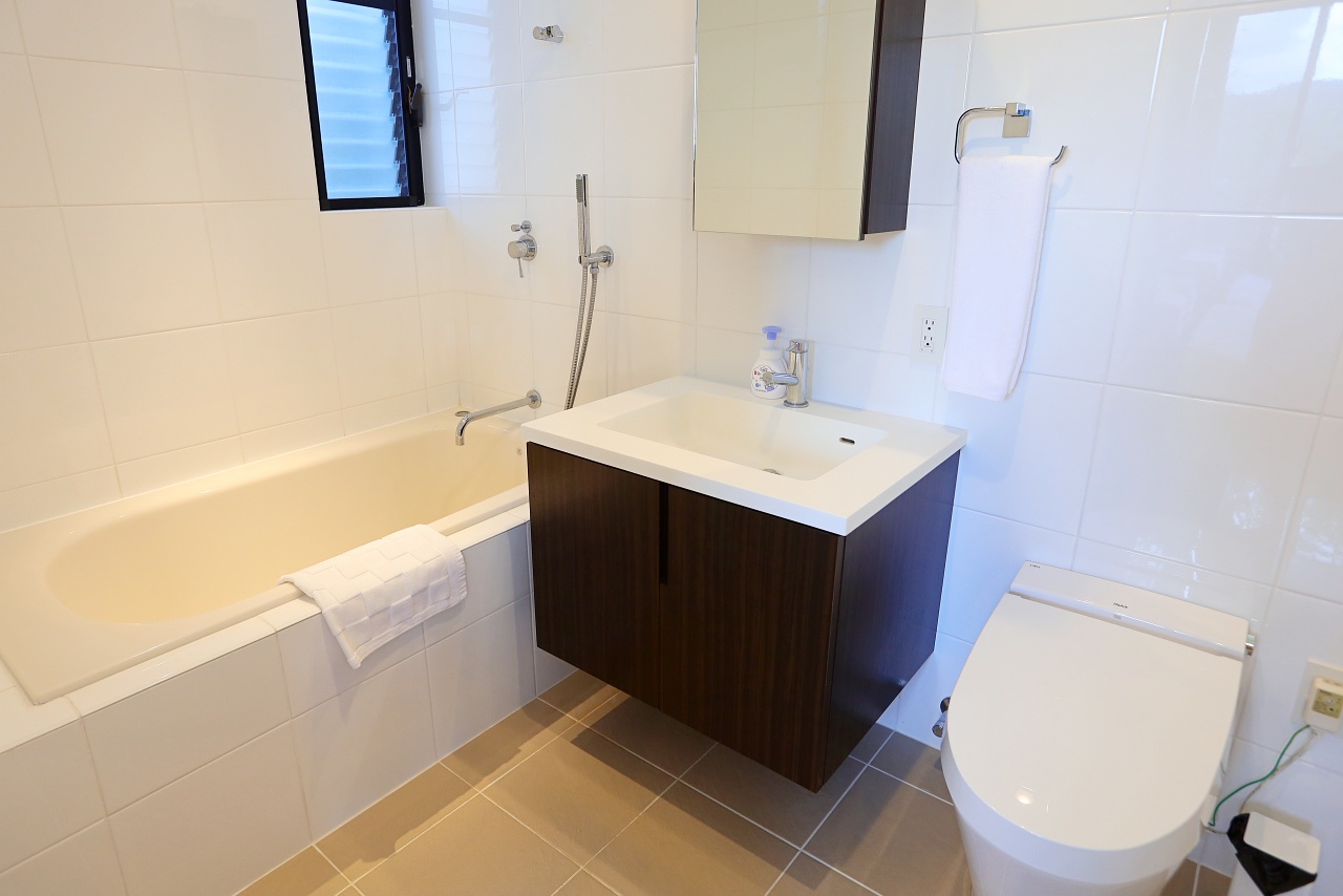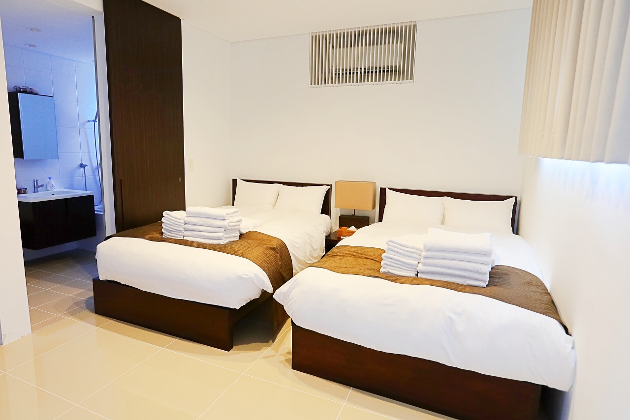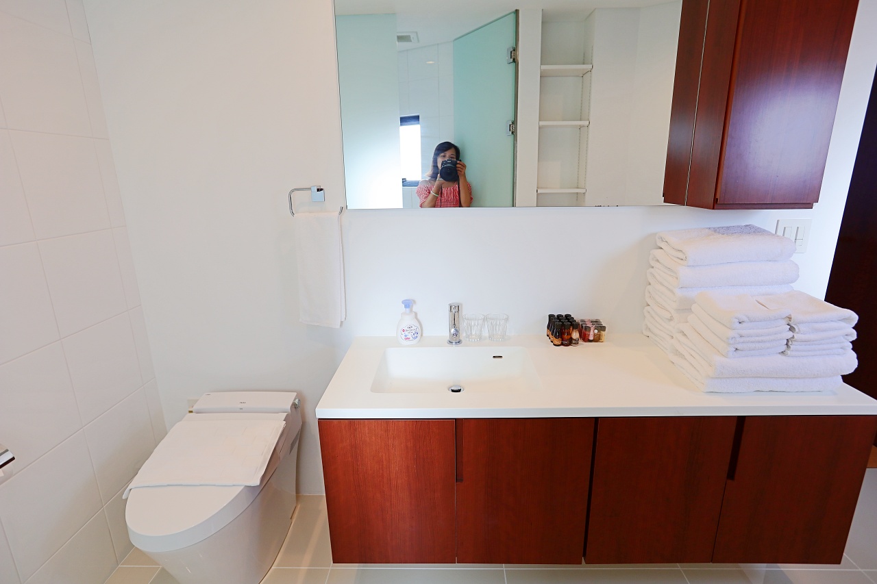 一樓房間有兩張雙人床,房間內擺設有圓形小桌(這個對於出外還需要用筆電工作的我實在太方便啦),還有大空間的更衣間。浴室乾濕分離有浴缸、淋浴設備、免治馬桶,以白色建築來說,環境清掃的挺乾淨的,沒有多餘裝飾,給人乾淨整潔又舒適的氛圍,一進到房間就忍不住往床上一躺,床墊跟枕頭都是舒適的。