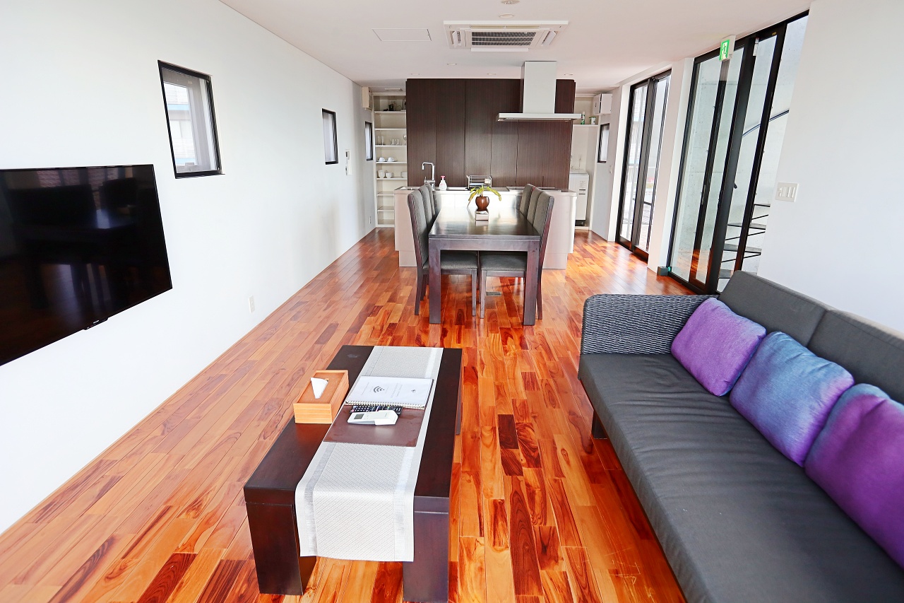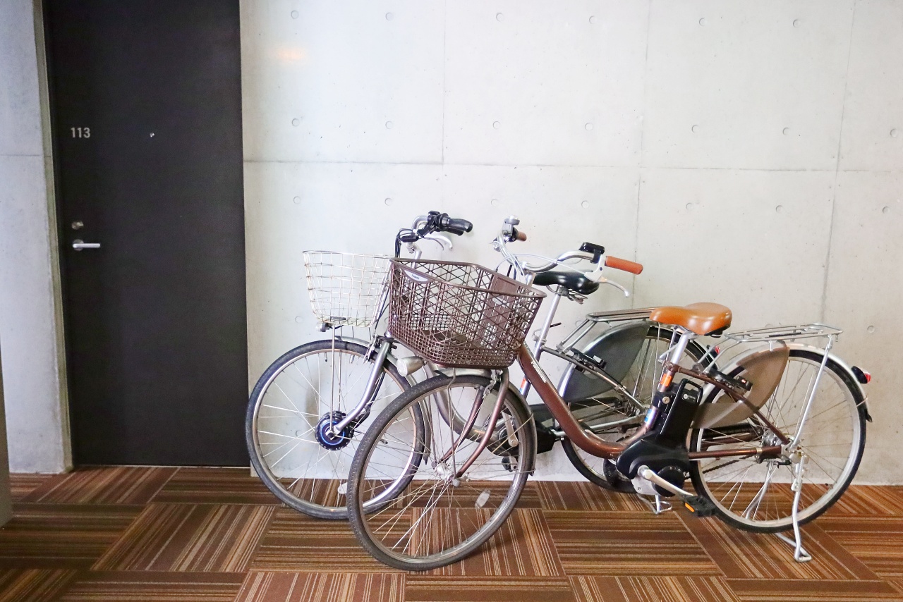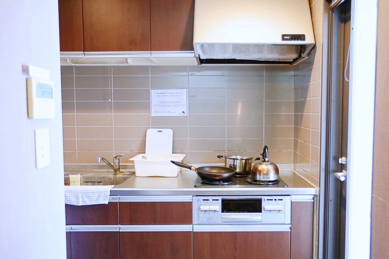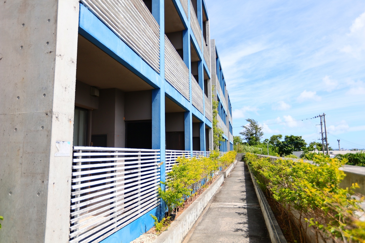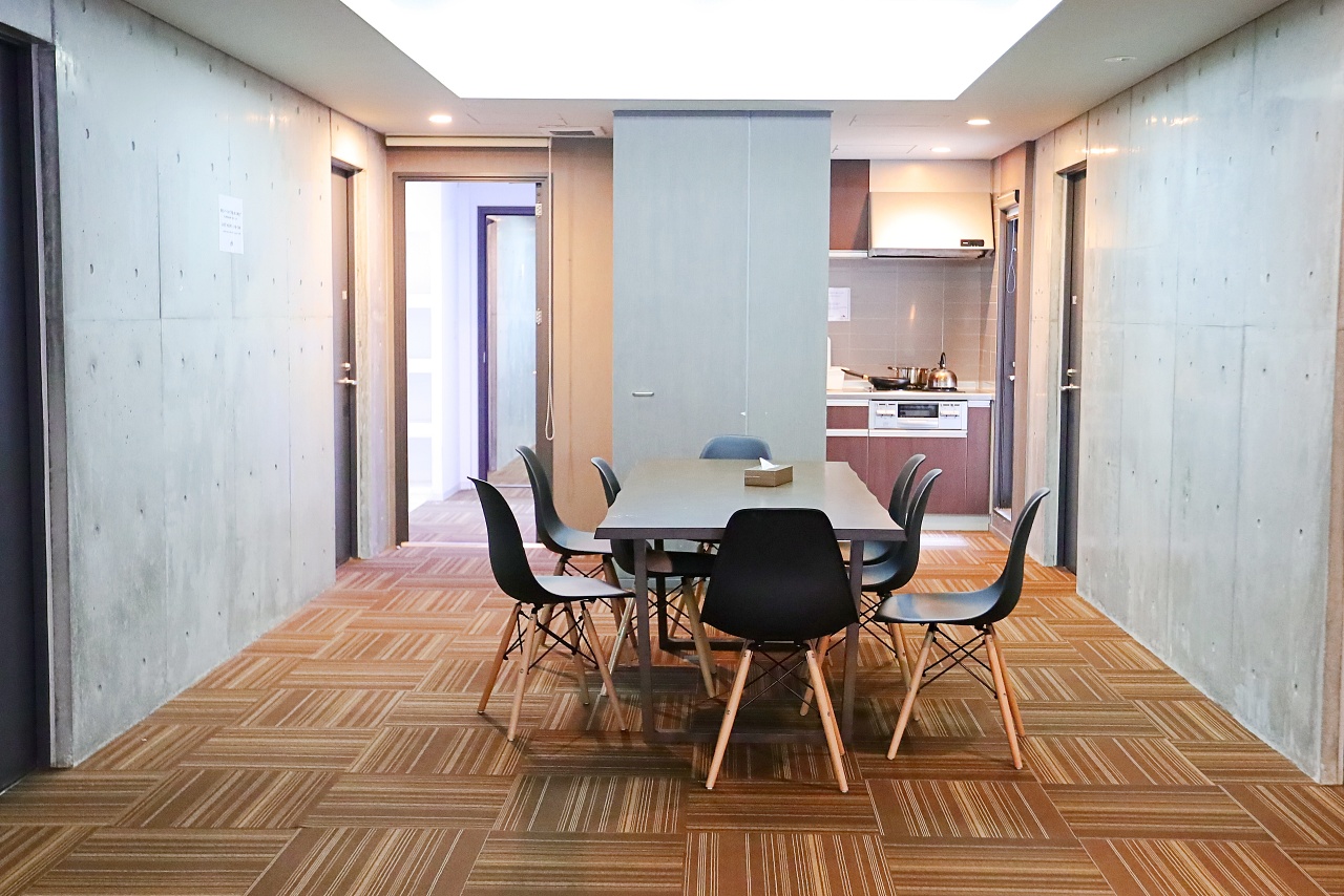 進入免費的公用停車場後看到的灰色底藍線條建築物就是公寓式住宿,預算不高、人數少可以選擇入住這種房型,空間就是一般日本常見的小空間。