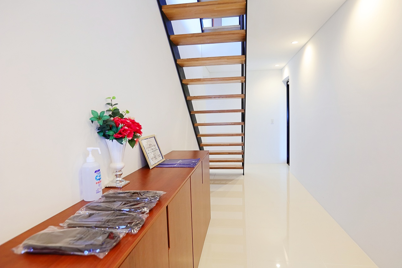 一樓入口處走進來是長型的置物櫃,上頭放著拋棄式內拖鞋、消毒酒精。非常簡單的擺設,有點像是樣品屋(笑)。